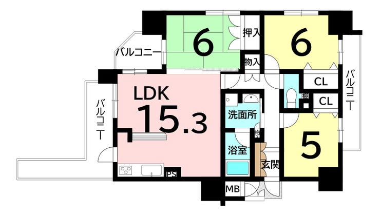 3面バルコニー